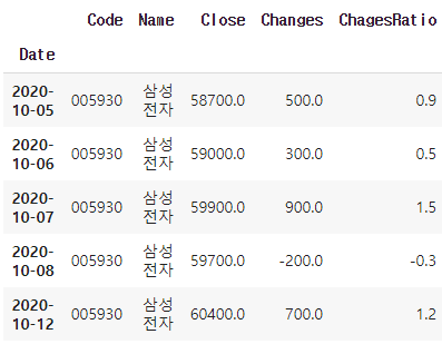 위 표에서 Code는 종목 코드, Close는 종가, Changes는 전일대비(증분), ChangesRatio는 전일비(증감률)다.